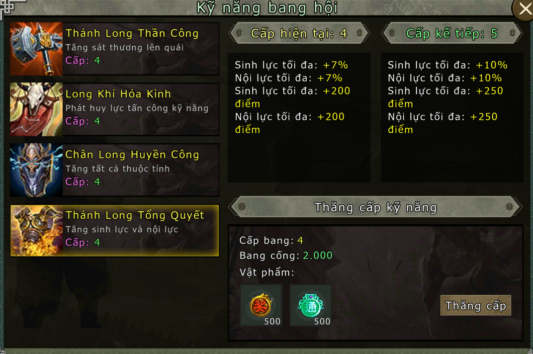 - Có thể tăng cấp và cấp độ tăng được của kỹ năng bang sẽ tùy thuộc vào cấp độ của bang.