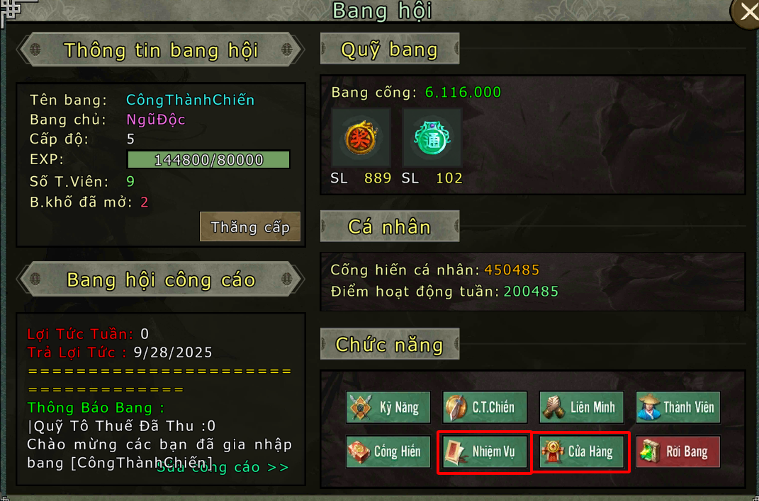 - Có thể làm nhiệm vụ bang hội hoặc có thể mua thẻ kinh nghiệm bang hội để tăng kinh nghiệm bang hội.