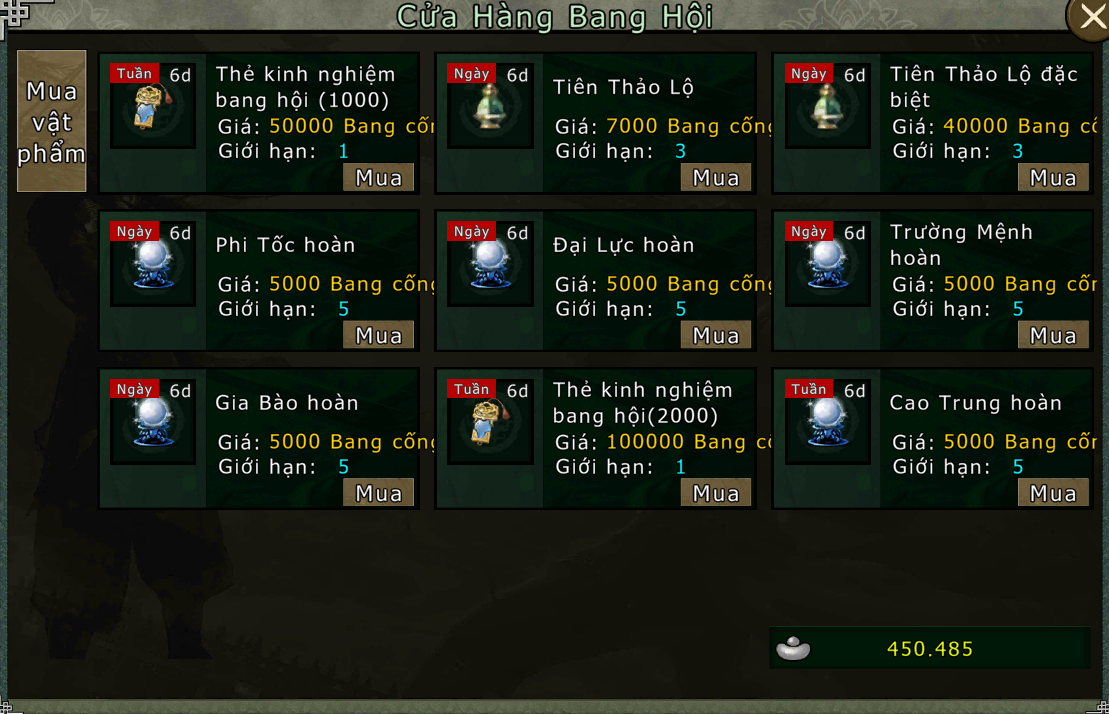 - Võ lâm lệnh: Dùng để tăng cấp bang hội, tăng cấp kỹ năng bang hội.