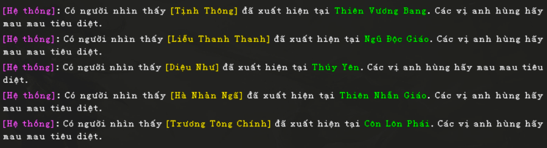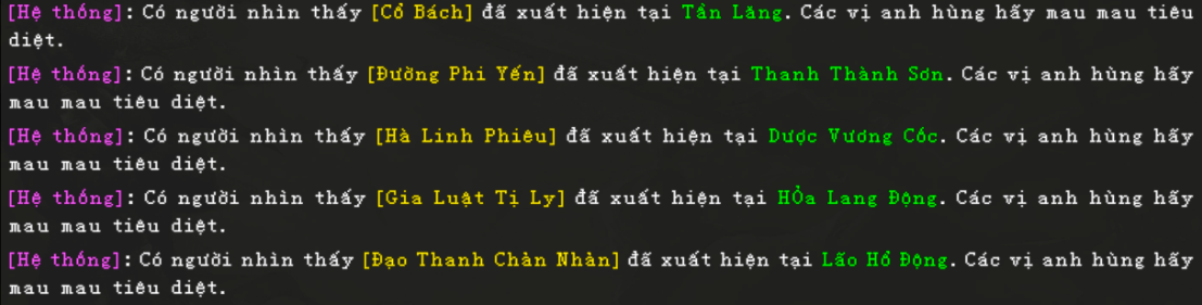 - Các Boss xuất hiện theo lịch cố định hàng ngày (0h, 1h, 2h, 3h, 4h, 5h, 6h, 7h, 8h, 9h, 10h, 11h, 12h, 13h, 14h, 15h, 16h, 17h, 18h, 19h, 20h, 21h, 22h, 23h).